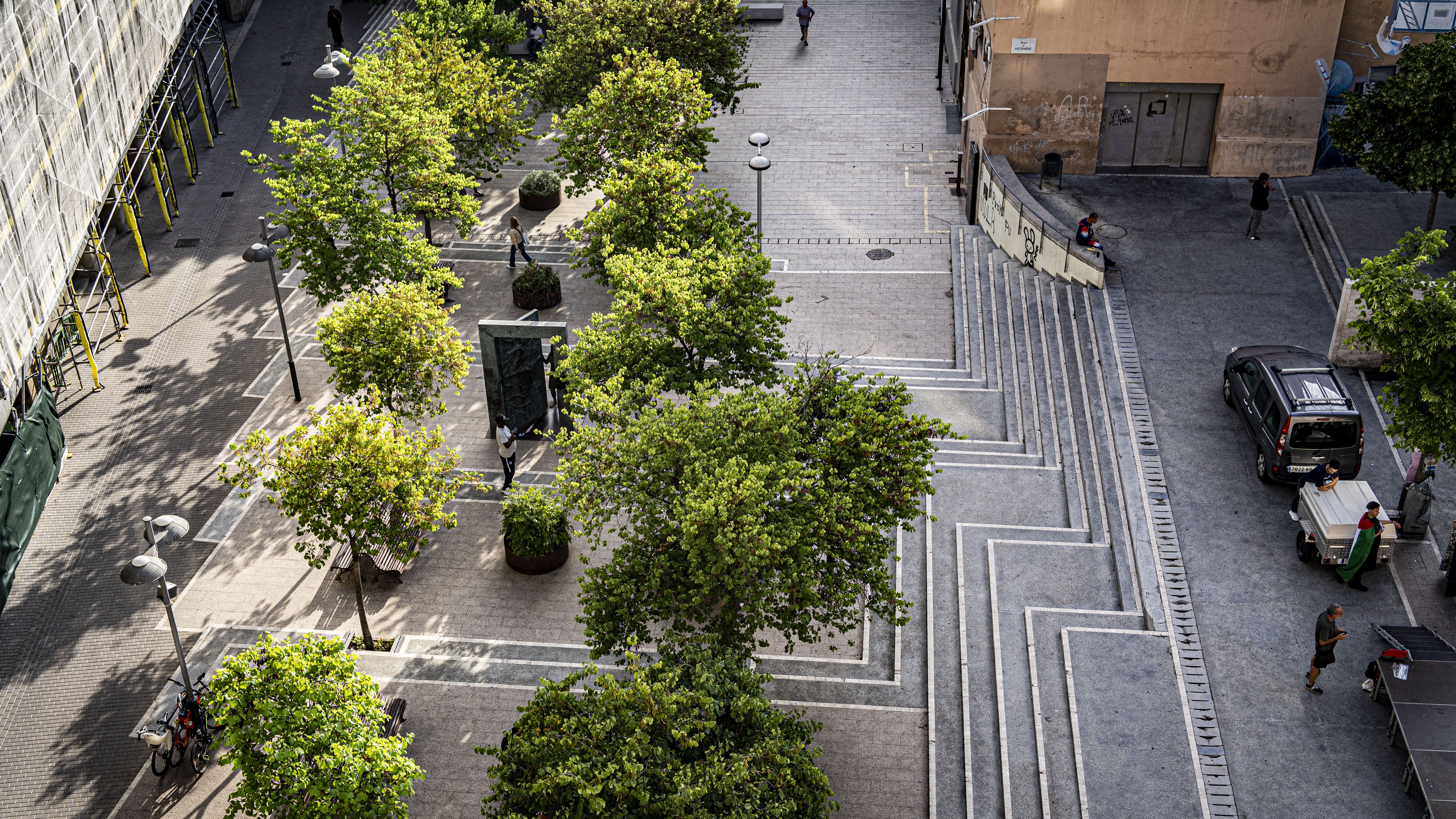 La plaça Fius i Pala amb la verdor dels arbres