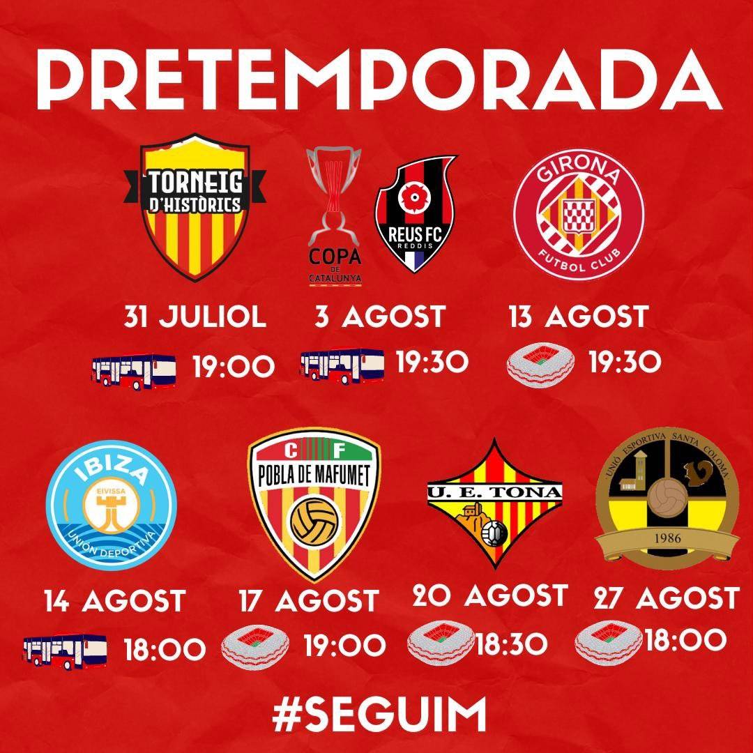 El següent partit serà dijous, 3 d'agost en la Copa Catalunya, enfront el Reus FC Reddis. Diumenge 13 d'agost al Congost, amistós enfornt el Girona FC ‘B’ - El dia següent l'equip es desplaça a Eivissa a disputar dos amistosos danvant l'UD Ibiza i l'Olot. Per acabar el mes d'agost amb 3 amistosos a casa, el 17 d'agost contra el CF Pobla de Mafumet, el dia 20 rebent la FUE Tona i tancant aquesta ronda de partits amb el Partit de Festa Major, diumenge 27 d'agost, davant el FC Santa Coloma d’Andorra.