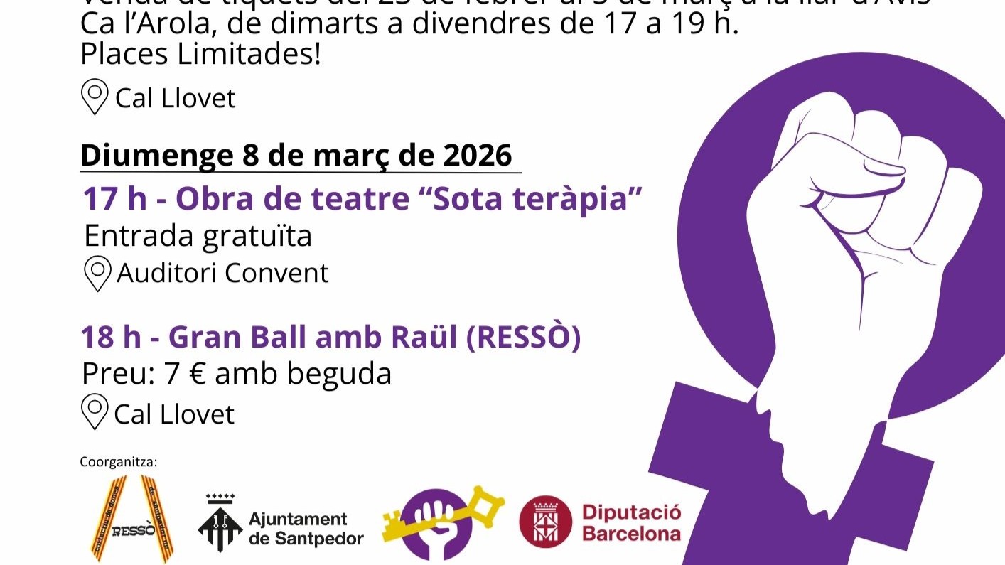 Una de les novetats és l’Escape City de temàtica feminista programat pel dissabte al matí a partir de les 11.30 h, a la plaça Gran U d’Octubre, coincidint amb el Mercat de Proximitat. Un joc de pistes per grups que acabarà amb un espai formatiu i de debat feminista. Per a participar-hi cal apuntar-se a través del formulari web: https://www.santpedor.cat/8m-escape-city-feminista/Abans, hi haurà la visita guiada “Les dones santpedorenques i La Séquia”, a càrrec de la historiadora Mireia Vila Cortina. Una caminada d'uns 6.5 km, per conèixer el recorregut que feien les dones del poble a principis del s. XX per anar a rentar roba als safaretjos del costat de cal Sequiaire. El recorregut començarà a les 9 h a l’oficina de Turisme (Cal Clarassó) i cal inscripció prèvia a través de l’enllaç: https://www.santpedor.cat/visita-guiada-les-dones-santpedorenques-i-la-sequia-2026/ No hi faltarà el tradicional dinar de dissabte a les 14 h i el ball de diumenge a la tarda a les 18 h, a Cal Llovet, organitzat per l’entitat de dones RESSÒ. El menú té un cost de 18 € i enguany serà una paella mixta, de carn amb bolets, postres, cafè i beguda. Els tiquets es posaran a la venda del 23 de febrer al 5 de març a la llar d’Avis Ca l’Arola, de dimarts a divendres de 17 a 19 h. El colofó final a la programació del 8M el posarà l’obra de teatre “Sota teràpia” del grup de teatre ‘Paranys’, a les 17 h, a l’Auditori Convent. En una nit de divendres tres parelles són convidades a participar d’una particular i relaxada sessió de teràpia: un intercanvi d’experiències personals, de desitjos, de somnis i frustracions. Aparentment res massa extraordinari. Però algú està absent en aquest experiment: la sessió aquest cop es desenvoluparà sense la tutela de la professional i la portaran a terme els mateixos pacients. L’Ajuntament vol animar a tothom a participar de les activitats, a combatre les desigualtats per raó de gènere en el nostre dia a dia i a commemorar una lluita històrica en defensa dels drets i del respecte entre homes i dones. |