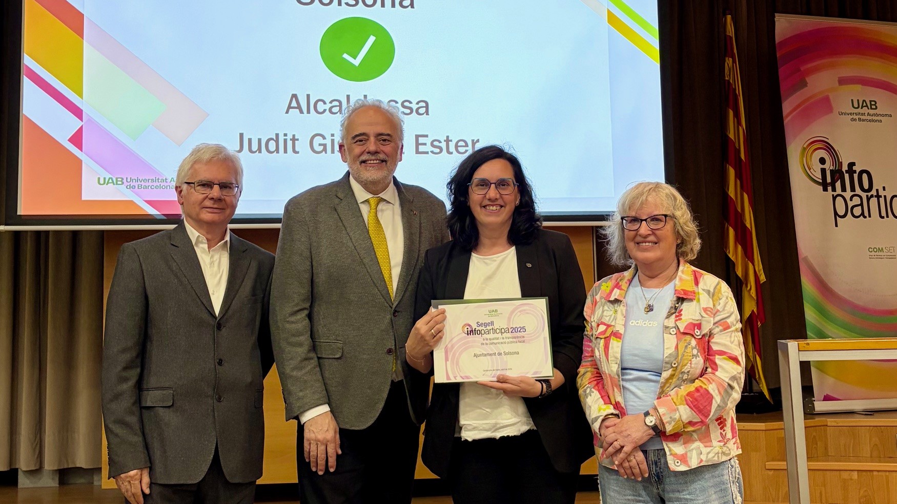 L’Ajuntament de Solsona ha revalidat el Segell Infoparticipa, una certificació que reconeix la qualitat i la transparència de la comunicació pública. El portal web ajsolsona.cat ha assolit una puntuació del 92,59 % en la tretzena edició d’aquest guardó, atorgat per la Universitat Autònoma de Barcelona. Aquest dimarts, l’alcaldessa, Judit Gisbert, ha recollit la distinció en un acte celebrat al Rectorat de la UAB i presidit pel rector, Javier Lafuente. En aquesta edició, el consistori solsoní ha complert 50 dels 54 indicadors avaluats, fet que el situa entre els 124 ajuntaments del país (el 13 per cent del total) que han obtingut el reconeixement. A la demarcació de Lleida, Solsona és un dels quatre municipis distingits i el segon amb la puntuació més alta. El Segell Infoparticipa avalua la informació publicada als webs municipals en àmbits com els representants polítics, la gestió dels recursos col·lectius i els recursos econòmics i les eines que s’ofereixen per a la participació ciutadana.